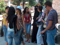 | When leaving the Hagia Sophia in June 2007, I paused in the shade with my nephew. Suddenly this transcultural encounter began. A group of young, chicque western dressed women began taking photographs of their friends posed with a few other tourists who just happened to be traditionally dressed women, also with impeccable fashion in black and veil. |